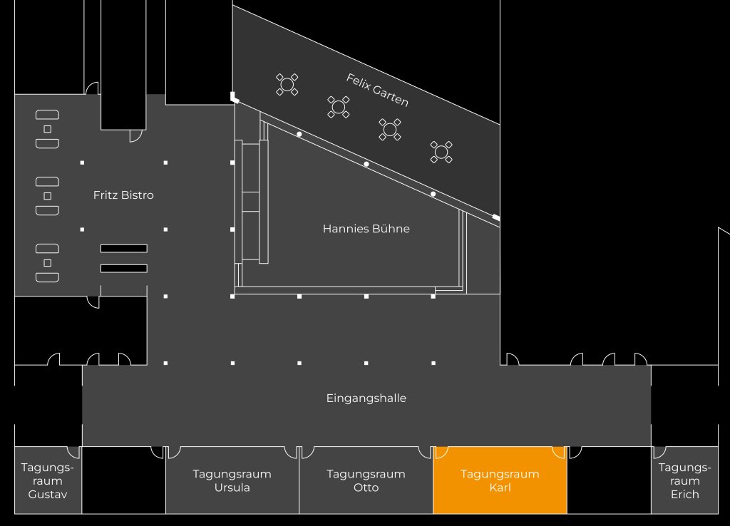 KARL 4 ist unser klassisch-moderner Meetingraum, der dir volle Flexibilität in der Gestaltung deines Events bietet. Egal, ob du eine intensive Diskussion oder eine große Präsentation planst – wir stellen den Raum nach deinen Anforderungen.